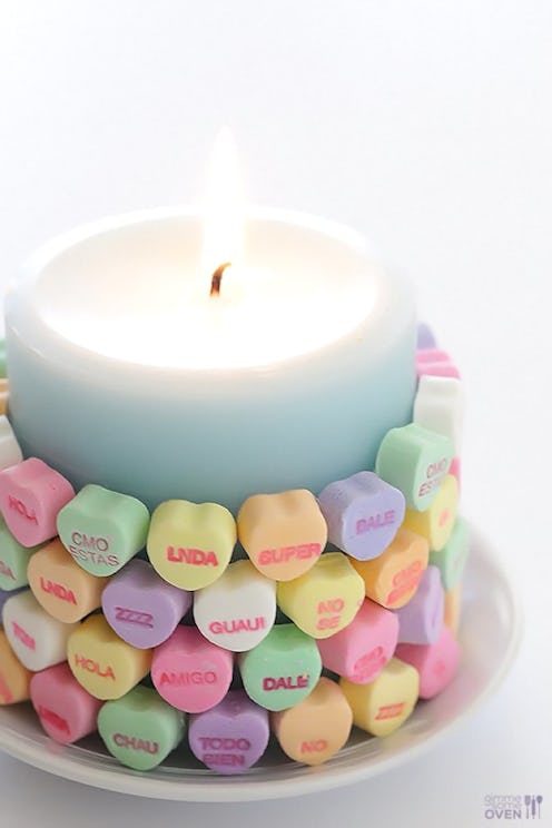 During the winter season, candles are wonderful for adding a cozy ambiance to any room. This V-Day, dress up your favorite candle with conversation hearts. According to Gimme Some Oven, it will only take you five minutes.