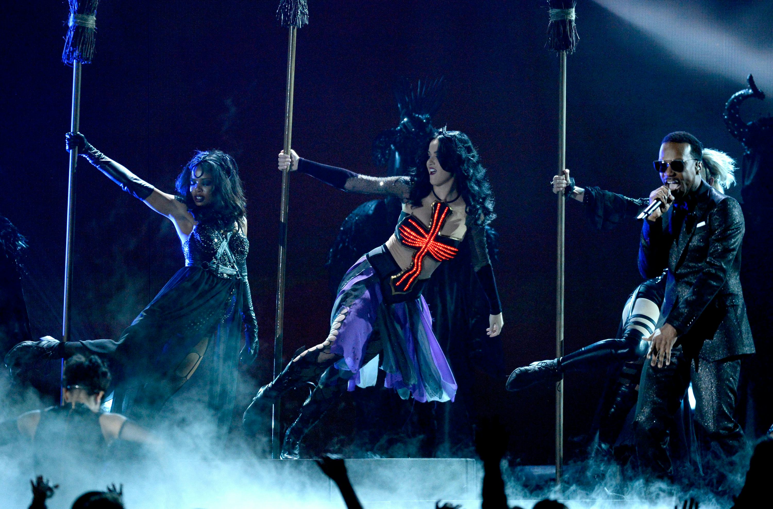 No, she didn't shoot whipped cream out of her breasts, lead a marching band, or even kiss a girl, but Katy Perry's 2014 Grammys performance did not disappoint.. The John Mayer-lovin' pop princess danced in front of a crystal ball (moon?!), grinded up on some over-sized broom sticks, and we think she may have just ended with a satanic-ritual type circle of fire. So, that was... different.