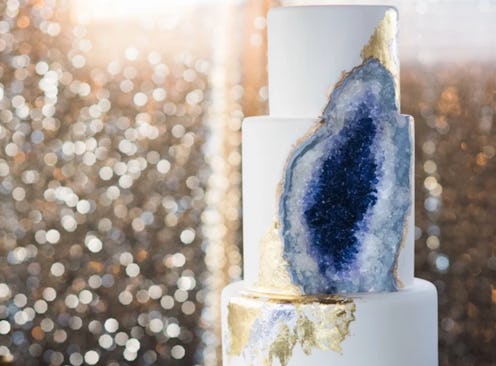 The cake itself is made from a combination of granulated sugar and rock candy, and was crafted using multicolored modeling chocolate on fondant covered cake. It took a whopping 16 hours to create, and that's not including all the time that went into the planning! "I was given several pieces of inspiration to draw ideas from, including actual geodes, a beautiful illustration, and a variety of table decor items like plates, chargers, and geometric floral arrangements," Rachael told Bustle. "I knew I wanted to create a show stopping cake and use the geode as the focal point creating an awe-inspiring visual experience for the guests."