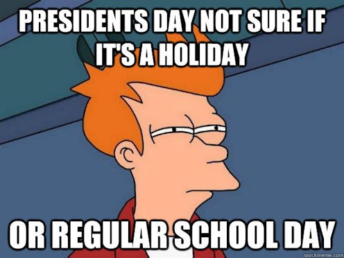 So are we celebrating the first president of the United States on Presidents' Day? Yes. Are we also celebrating the other 43 men (and hopefully in the near future... women!) who have taken the role of guiding this country's politics? Yes. I'm not saying you have to spend the day writing "thank you" letters to President Obama, but at least now you know why you have Monday off (or should have it off, if you don't). Now enjoy some memes.