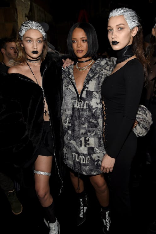 When Rihanna's debut collection for Puma was announced, there was tons of excitement, and her Puma show definitely lived up to the hype. She based her looks around street-style, which mixed perfectly with '90s-sequel accessories. Besides her fabulous streetwear meets grunge aesthetic, it helped that she also had gorgeous models to pull off the looks. Now, I have never seen the Hadid sisters wear black lipstick in their everyday lives, but after seeing how badass they look with it on, I hope they start. Their spiderweb-y slicked back hair also paired well with the streetwear vibe.