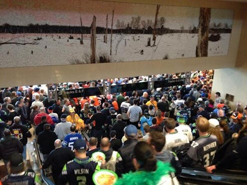 With the first "Mass Transit Super Bowl" taking place near New York — in East Rutherford, N.J. — traffic was inevitable. But even those accustomed to bumper-to-bumper terribleness just through the tunnel or over the bridge couldn't anticipate exactly how much of a clusterfuck the Super Bowl would be. Terrifying pictures and video have been flooding into Twitter not only showing the immense traffic around the stadium, but also the crowds in every New Jersey Transit stations. (The picture above? That's from the Secaucus station, courtesy of @darrenrovell.) In fact, the crowding has become so extreme, several fans have already collapsed while on their way to the game.