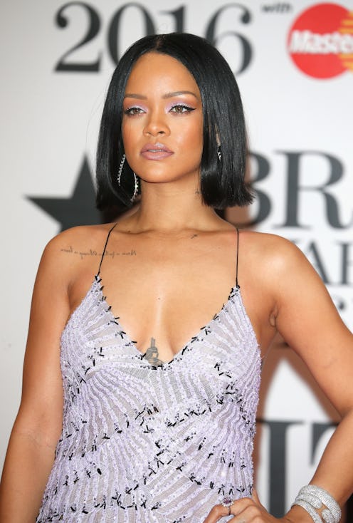 Her beauty look was another thing to marvel at. Rihanna is one of the many celebs who have transitioned to a trendy blunt hair cut, which was on full display at the Brit Awards. And, because she's Rihanna and she can do whatever she wants (like making blue lipstick the next It color), she paired her blacked wing eyeliner with a shimmery, almost frosted pastel purple eyeshadow that reminds me of something I would've worn as a child of the '90s.