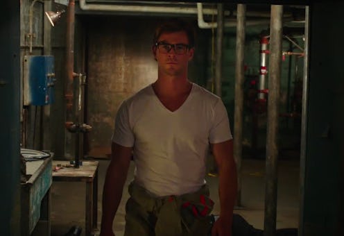 In the first released photo of Hemsworth in Ghostbusters, he sure looks like one studly secretary. Wearing a pair of devastatingly nerdy and attractive glasses and vest, Hemsworth looks the part, sitting behind a desk in front of a computer and office phone. Based on the photo, you might thing he really plays the stereotypical secretary role. But the trailer tells another story. The teaser shows Hemsworth, now free of his suit and tie uniform, kicking down a door wearing one of the famous Ghostbusters' jumpsuits. Hemsworth isn't a nerdy secretary anymore. He's muscle — he's an action star.