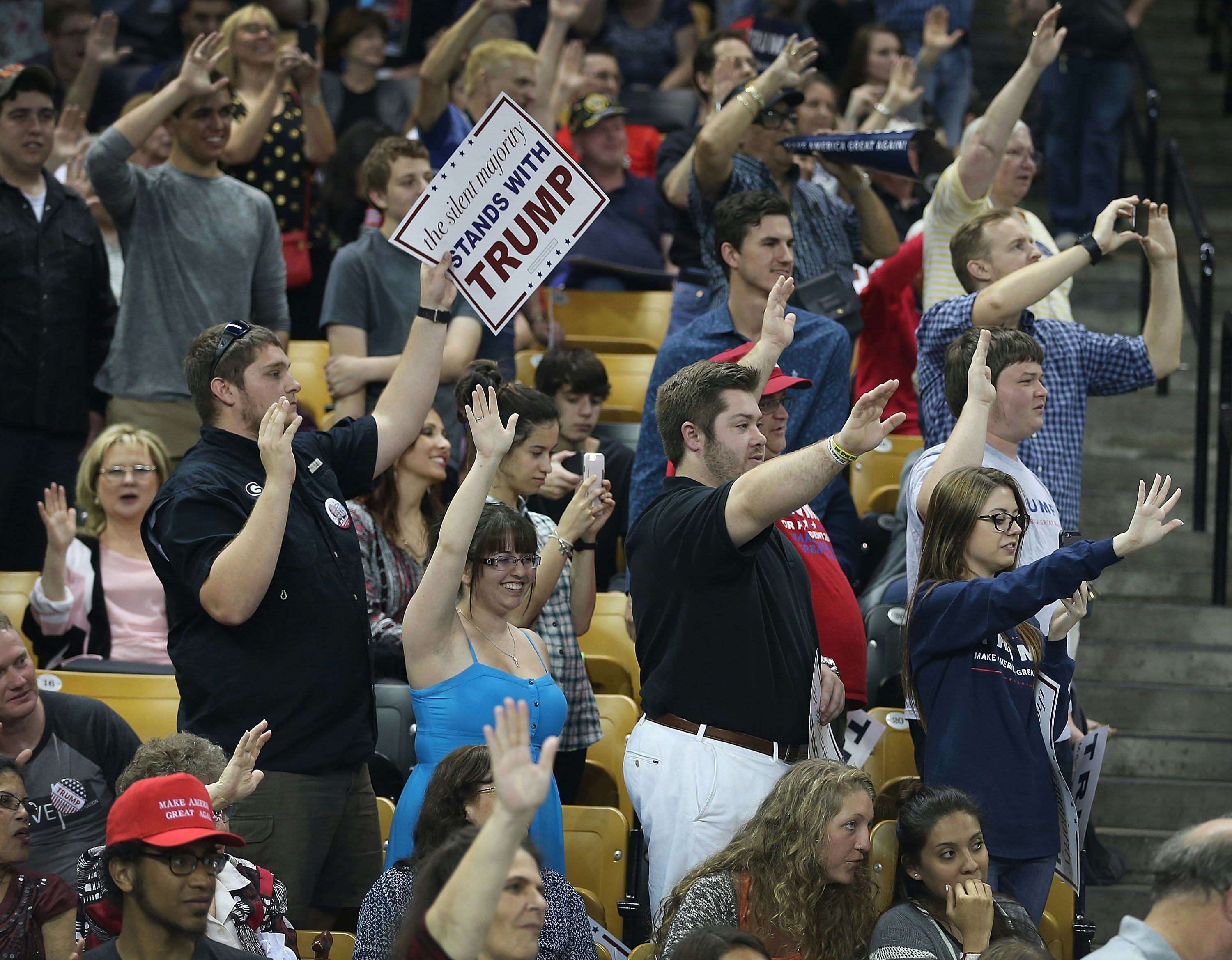 On the strength of the images captured from the Trump rally, you can definitely see that many people are simply holding their arms aloft to pledge that they'll vote Trump ― a slightly authoritarian look, sure. But there are also undeniably some people whose arms are jutting forward in a style far more reminiscent of the Nazi salute.