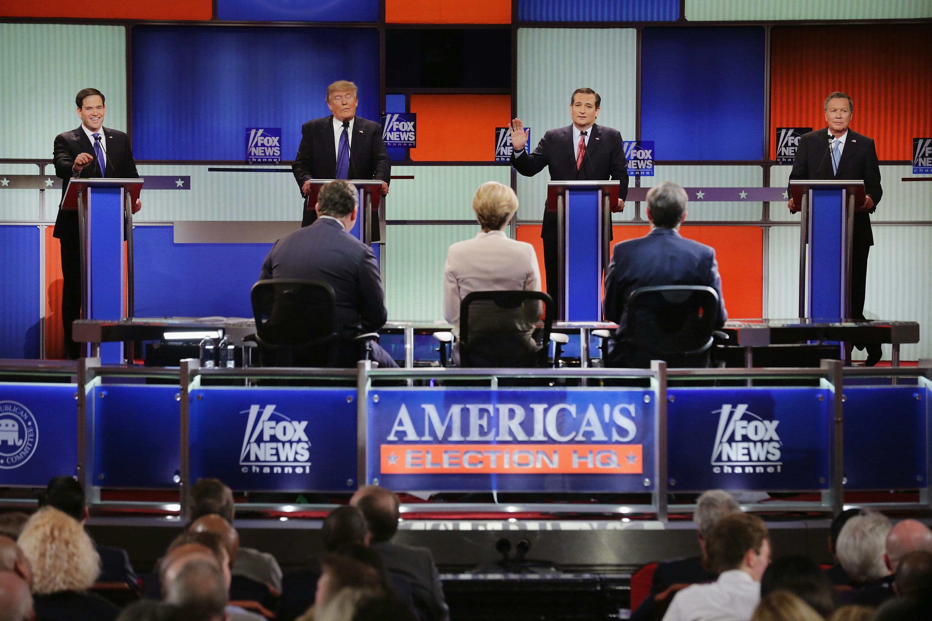 Candidates appeared rather subdued as they took the stage, and then promptly observed a moment of silence for former First Lady Nancy Reagan, whose funeral is set to take place on Friday at her husband's presidential library in Simi Valley. Following a performance of the national anthem, John Kasich, Marco Rubio, Ted Cruz, and Donald Trump all gave opening statements that appeared far less caustic than language heard in the previous debate. Though there have been far fewer verbal fireworks erupting, social media nonetheless had plenty of fodder to poke fun at the debate the whole night through.