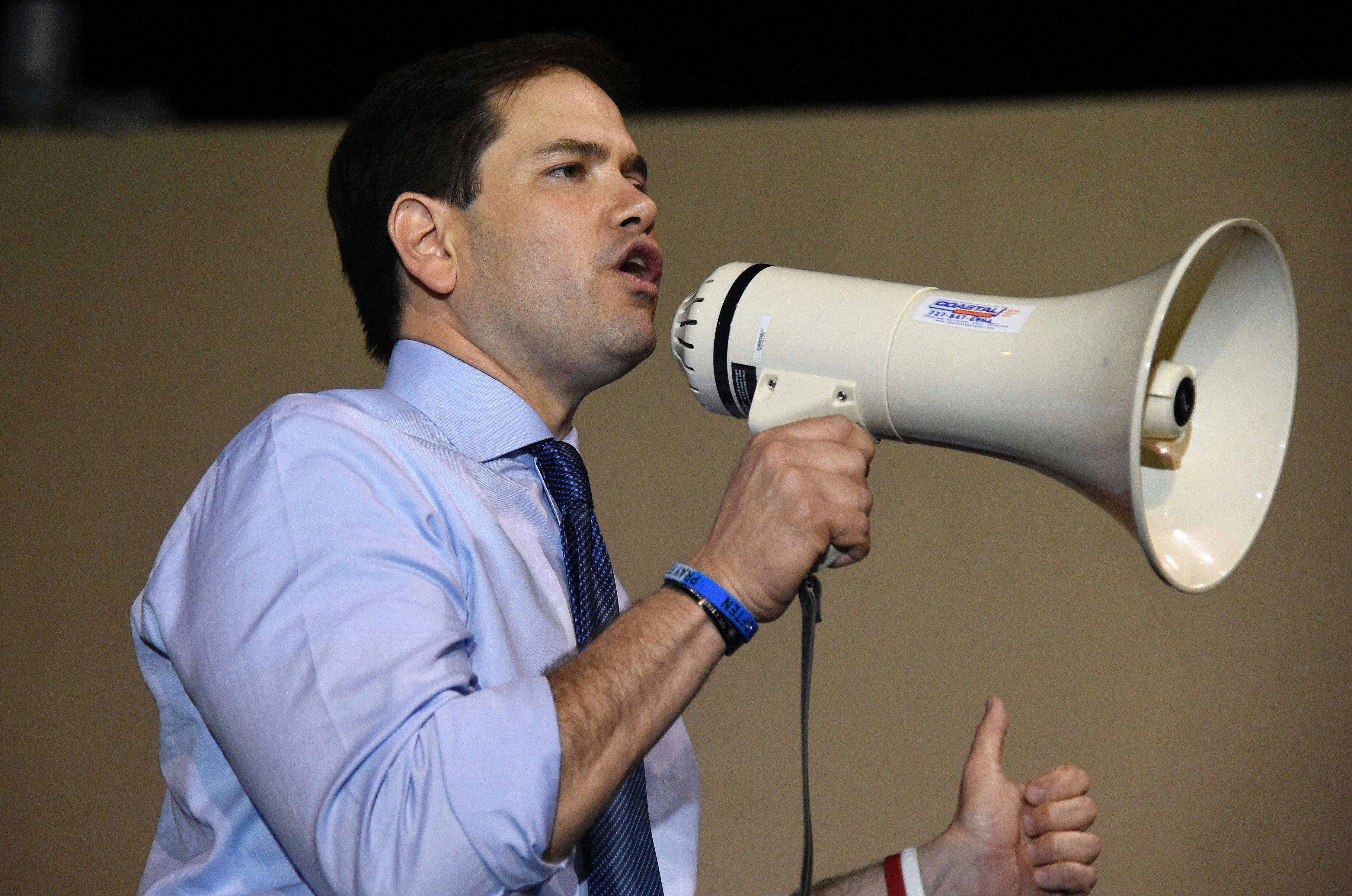 In a concession speech made after a crushing primary loss in his home state, Florida Sen. Marco Rubio still managed to make a stab at Donald Trump. After being interrupted by hecklers, Rubio said, "You won't get beat up here." It was a clear reference to the violence that has broken out at Trump events, with protesters and sometimes even members of the media getting attacked. It was no surprise that Rubio was taking aim at Trump; The Donald stole Rubio's home state from him in a big way, beating him by double digits. And Rubio's paying the price for the defeat, announcing that he's suspending his presidential campaign.