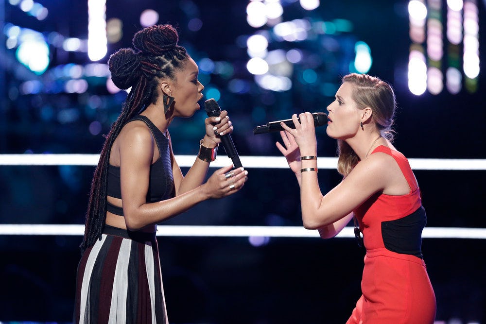 Talk about girl power! Pharrell paired his two female powerhouses in the Battle Rounds and it was one of the best duets yet. Team Pharrell's Hannah Huston and Maya Smith battled it out to Sia's "Elastic Heart" and completely blew the coaches away — so much so that it was almost impossible to choose a winner. Someone had to win though, and that was Huston. Her showing was just that much stronger than Smith's to edge her out and take the victory. Smith got lucky, though, and earned a steal from Christina Aguilera.