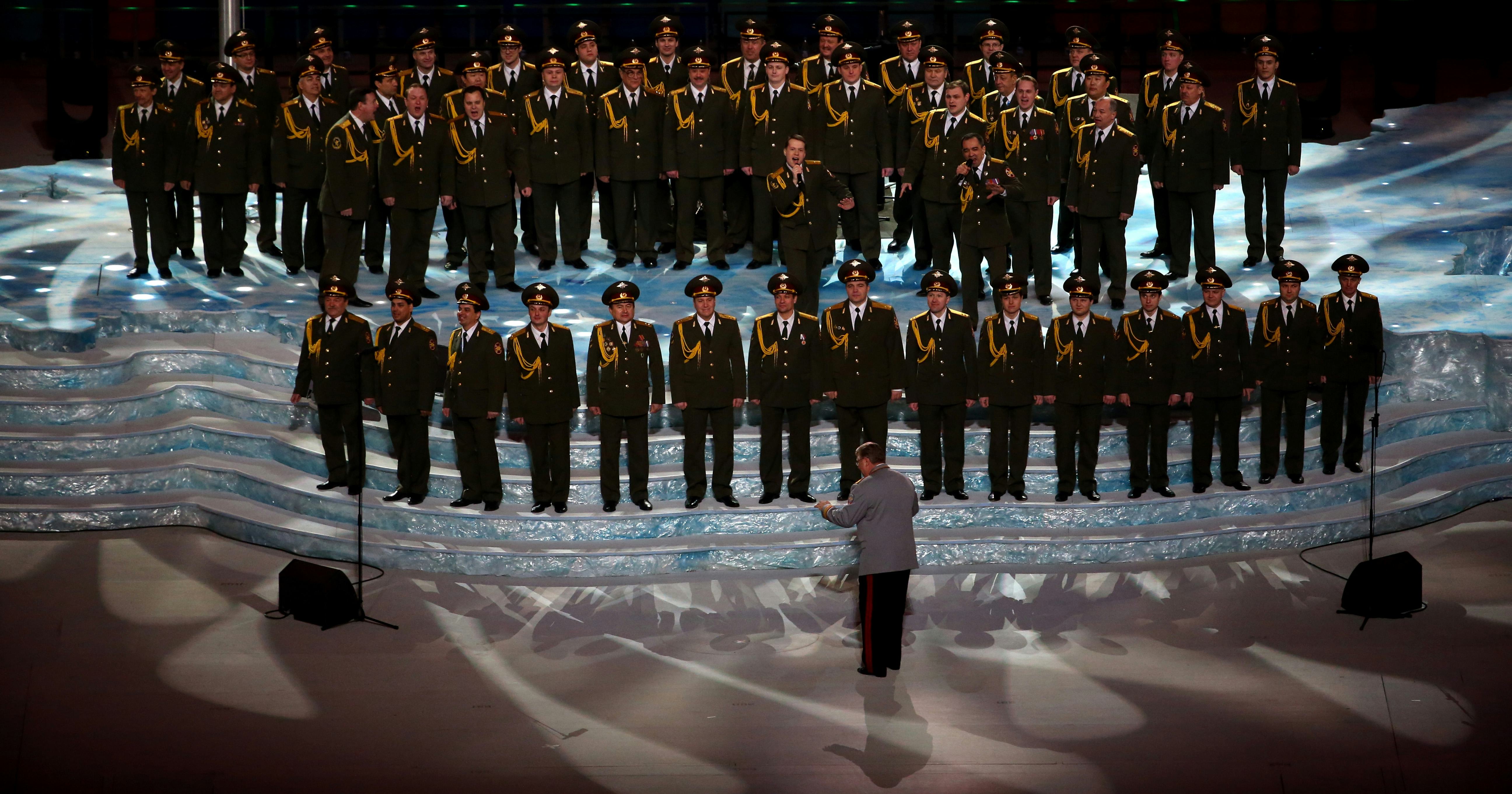 In full uniform, a large group of men from the Russian Interior Ministry stood on some kind of stage, complete with fog and flashing lights. The most surprising part might be that they're actually pretty good, especially since they're singing it in English.