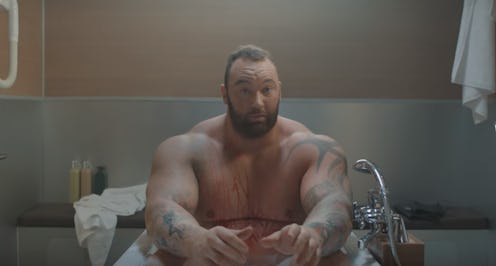 On Game of Thrones, one of the most violent, vicious villains is Gregor "The Mountain" Clegane, played by actor Hafthór Júlíus "Thor" Björnsson. He's the brother to The Hound and killed the hottest character ever, The Viper. But IRL, the 27-year-old, six-foot-nine Björnsson is a pretty cool guy. He's one of the strongest men in the world, used to be a professional basketball player, and is practically a modern viking. And now he's even got a fake brand of water for April Fools' Day: Heavy Bubbles. In a new faux ad, which premiere on Friday, Björnsson teaches you how to be like him by drinking the sparkling water that comes not in liters or ounces but in kilos, two, five, and 10, so you can exercise by carrying the dumbbell-shaped bottles around in your daily life. If only the product were real, because Game of Thrones devotees are amazing consumers.