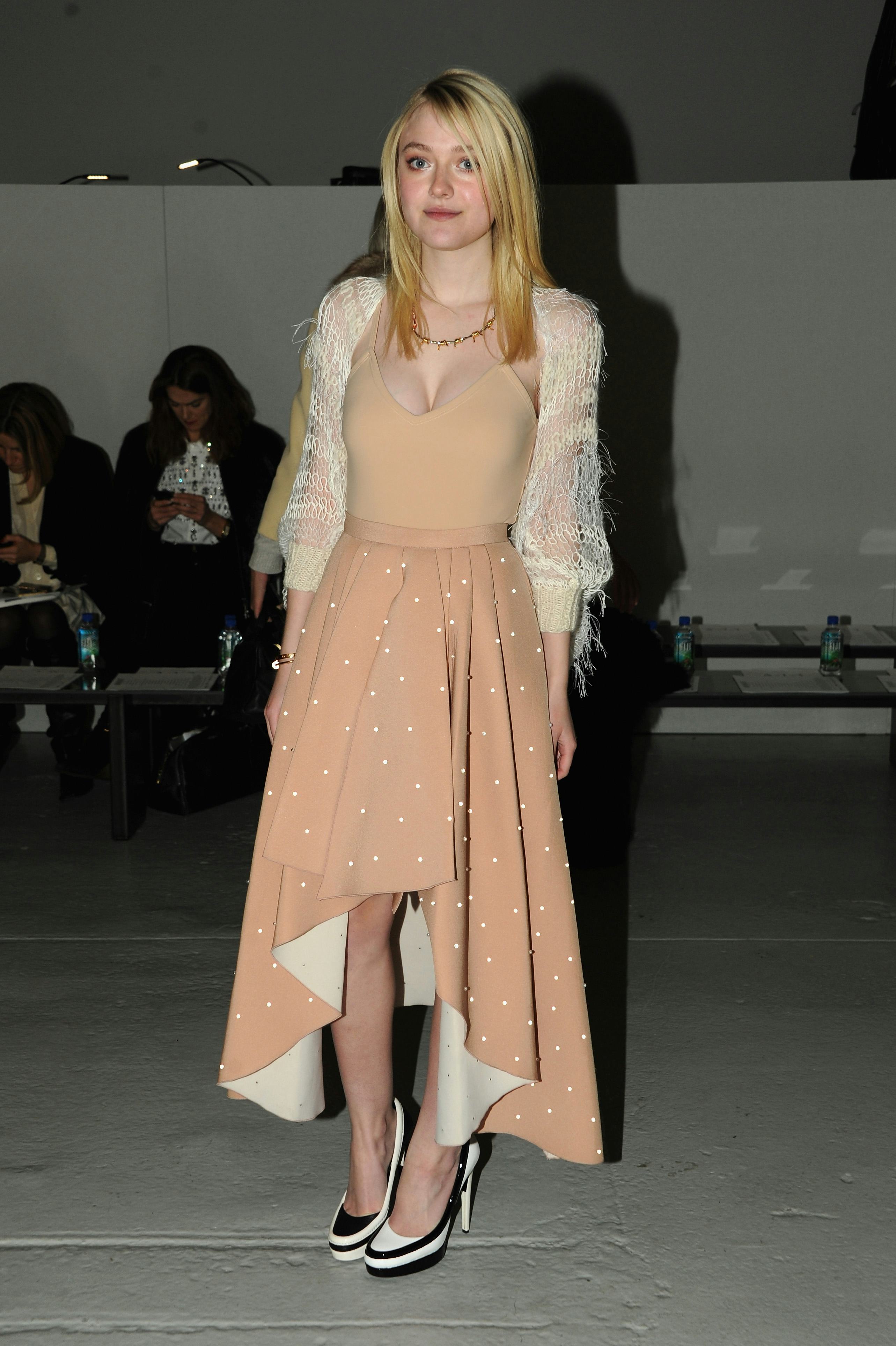 Seen on anyone other than the 19-year-old actress, the nude tank and high-low skirt combo — which she paired with a cream crocheted cardigan, a simple gold necklace, and kitschy black-and-white loafer pumps — may seem entirely tame. But it was the cleavage on display that Fanning turn a few heads, for better or for worse.