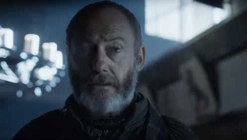 Davos may also be talking to the wildling leader, Tormund, as the kissed-by-fire member of the Free Folk is seen in some battle-type situations and also has the first line of the trailer. "I thought he was the man to lead us through the long night, but I was wrong," he says. Maybe Davos is saying to Tormund, "Yeah, Jon's gone, so now it's up to you."