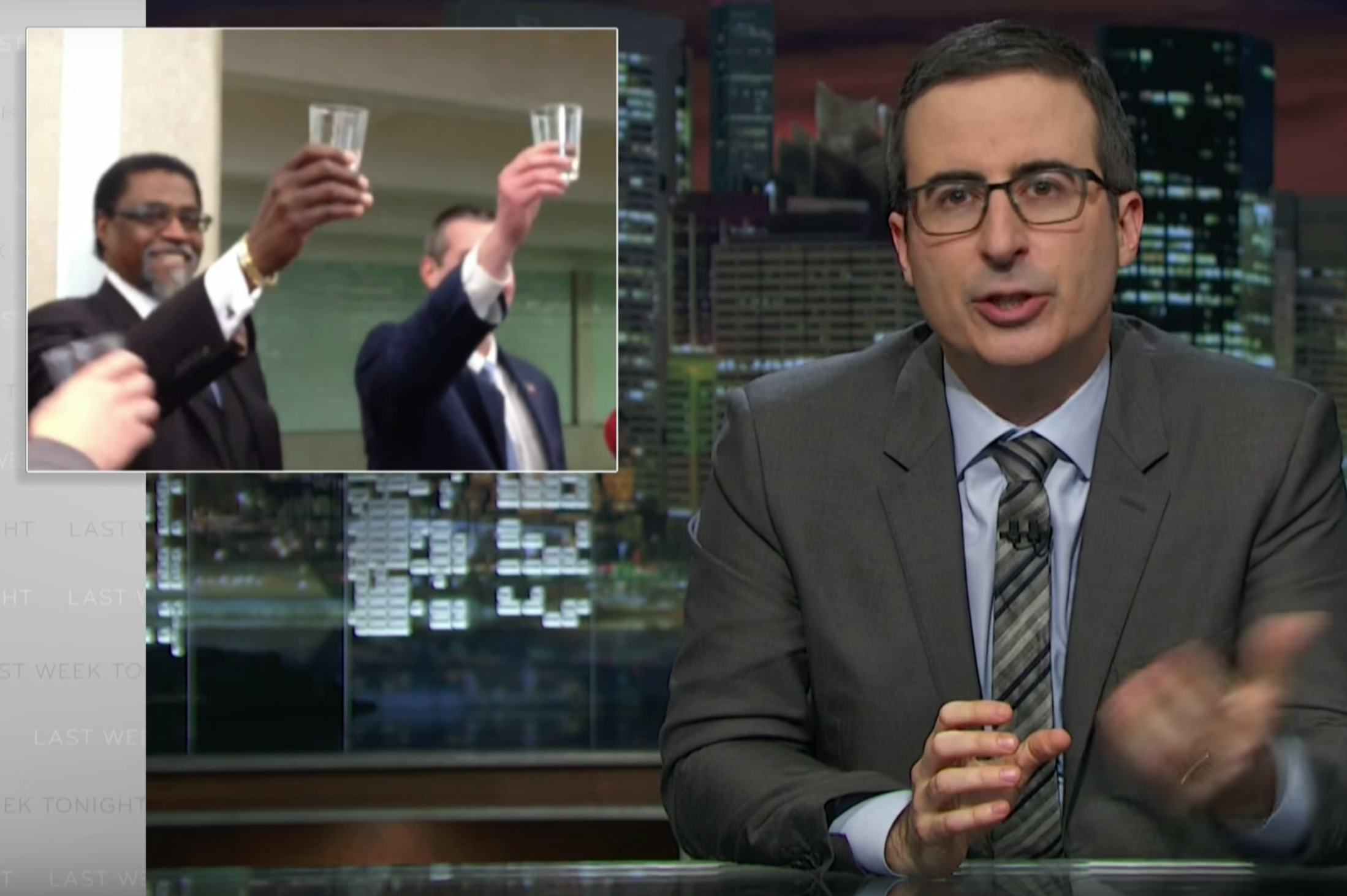 "It's a little weird to see people make a toast as they essentially drink poison," John Oliver quipped Sunday night on HBO's Last Week Tonight. The talk show host explained what's not so funny about this tragedy, while rolling video of inept public officials clinking their glasses. That poison, of course, is Flint, Michigan's water supply. They were celebrating the city's change to a new water source, the same one that would go on to degrade Flint's pipes and poison its people. You'll be able to better understand the Flint crisis after watching Oliver tear into lead poisoning, a problem that extends far greater than the borders of the city, or even Michigan.