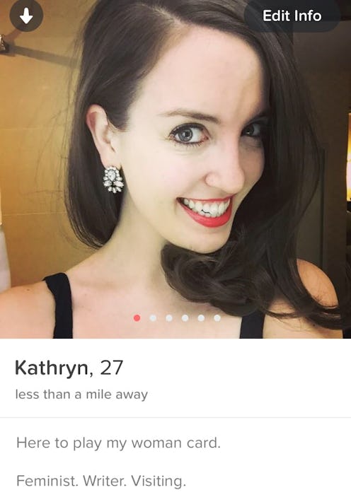 I was beginning to sound like a broken record, but I was also surprised by how many people were latching on to my "woman card" comment to initiate conversation. Of course, I would love for someone to ask me more about this — nothing is sexier than discussing gender equality on a first date — but I wondered if the reason this line was working so well was mostly because of its short-lived trending hashtag status, and I was a little dismayed by how quickly people were willing to write it off as an uncomfortable joke.