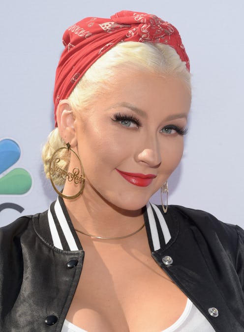 Aguilera wore her hair straight with a center part, and had a face-framing braid on one side, studded with a series of large metal rings. And yeah, it's just as fierce as you're imagining it is. She kept her makeup dark to up the edgy vibes, with a deep plum lipstick, bold lashes, and some lavender eyeliner to complement her hair, and the whole thing was literal perfection.