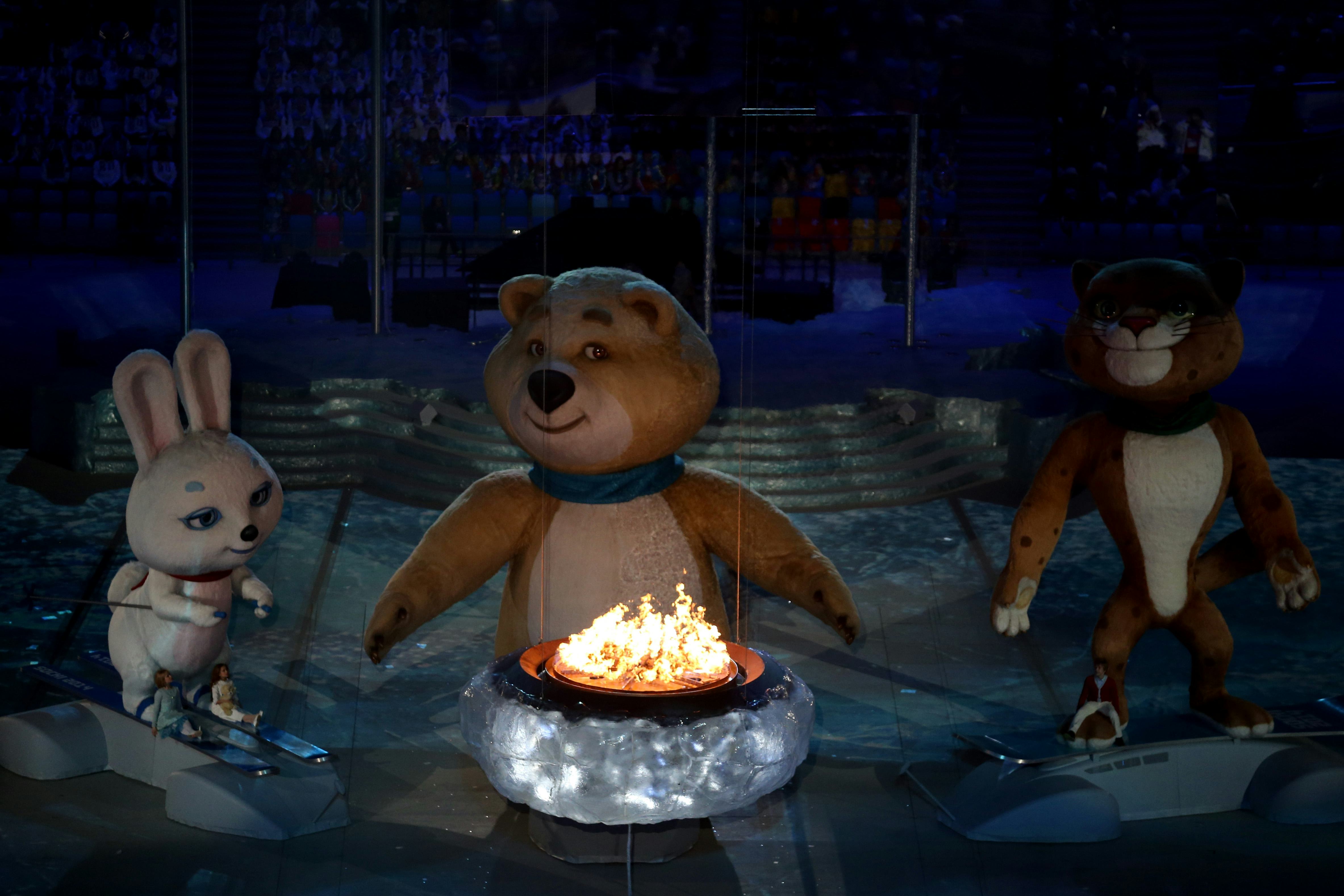 Clearly, though, the Olympic ceremony directors didn't think that Sochi Bear was creepy enough. During Sunday's closing ceremony in Sochi's Fisht Olympic Stadium, the three animals entered the stadium in all their life-like glory, dancing around the children and huddling beside the fire pit in the center of the floor. The Polar Bear breathed a sad sigh onto the Olympic torch, blowing out the fire and, at the same time, extinguishing the torch’s flame in Olympic Park. The Charmin-like bear then looked up and around at the audience, became overcome with emotion and shed a single, giant blue tear — marking the end of this year's surreal ceremonies (and personally giving me the heebie-jeebies.)