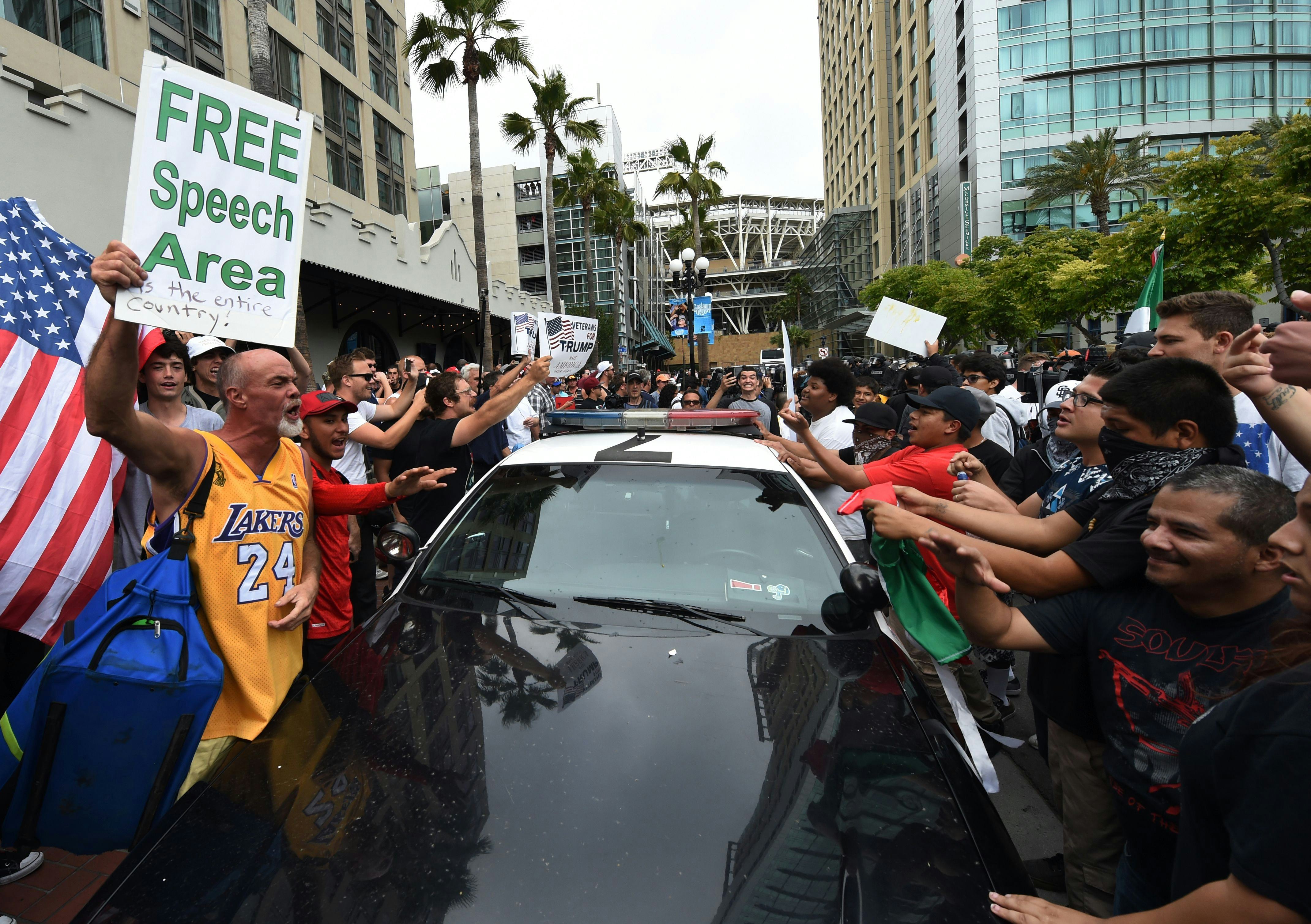 Approximately 1,000 protesters gathered outside the convention center Friday afternoon, the San Diego Police Department confirmed. The violent rise reportedly began after Trump supporters mixed with the anti-Trump protesters, who were kept to a partitioned demonstration area outside the convention center. Altercations inevitably broke out between the opposing sides.