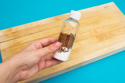 Start the DIY by placing a cone funnel into your empty bottle. This will make the process of pouring and mixing the dry ingredients together a little easier. If you don't have a pre-bought funnel lying around the house, you can easily make one with paper.