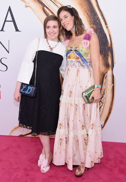 In a move that I didn't totally expect, Lena Dunham totally stole the show at the 2016 CFDA Awards on the red carpet with jewelry designer Irene Neuwirth. The Girls actress and producer attended one of fashion's biggest nights with Neuwirth, who's a CFDA member and known for her colorful jewelry designs. She totally brought that color to the red carpet, and Dunham's black and white look (accented with Neuwirth's jewelry, naturally), was the perfect contrast. But the best part of the outfit was Dunham's furry bunny slippers, which were totally whimsical and so her.