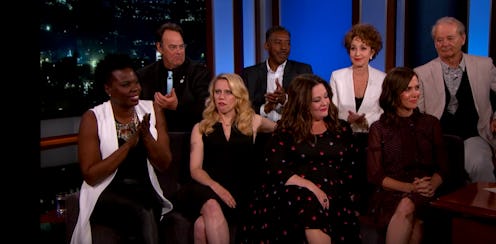 The cast of the new Ghostbusters reboot was on Jimmy Kimmel Live following the third game in the NBA finals to promote their new film and celebrate the 32nd anniversary of the original Ghostbusters' release — aka Ghostbusters Day. Funny ladies Melissa McCarthy, Kristen Wiig, Kate McKinnon, and Leslie Jones took over Jimmy Kimmel's show on Wednesday night, where they were joined by four members of the original cast, Bill Murray, Dan Aykroyd, Annie Potts, and Ernie Hudson — all of whom are rumored to have cameos in the new film. The original and new Ghostbusters casts responded to the backlash from the all-female Ghostbusters team, joking about the sexist comments lofted their way by fans on the Internet.