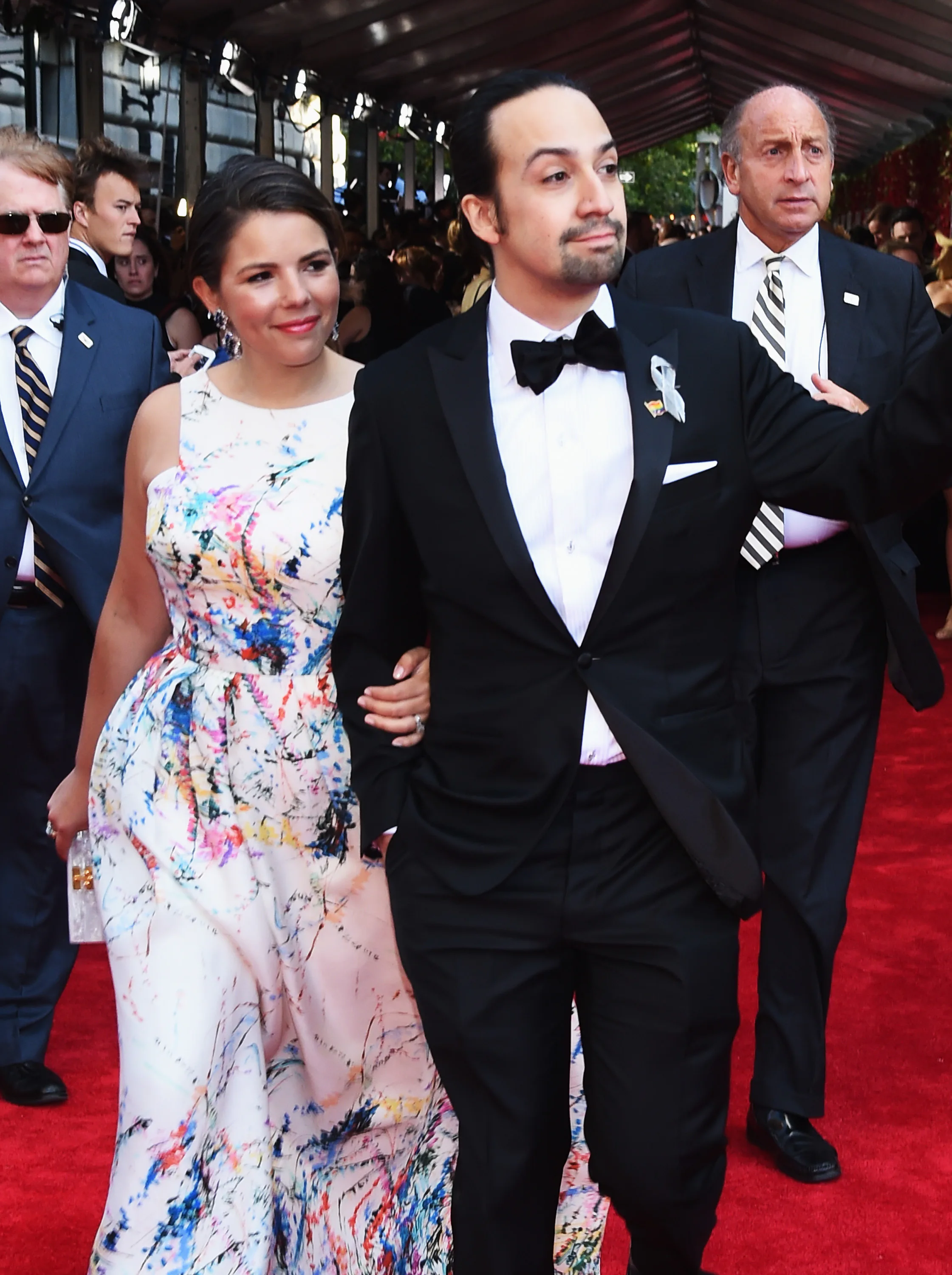 OMG! Hamilton star Lin-Manuel Miranda and his wife Vanessa Nadal are once again relationship and style #Goals. The couple complemented each other so well at the 2016 Tony Awards, especially on the red carpet. Their red carpet attire was hardly ostentatious. Instead, they opted for dapper, classy, and classic. Miranda wore a black tux with a bow tie, which he paired with black sunglasses upon the first sighting. It was anything by basic. Nadal looked equally as head-turning in a sleeveless, white frock with splashes of blue and pink print, a square neck, and a cinched waist. Her dress had a bit of a retro, '50s-era vibe and it looked absolutely lovely on her.
