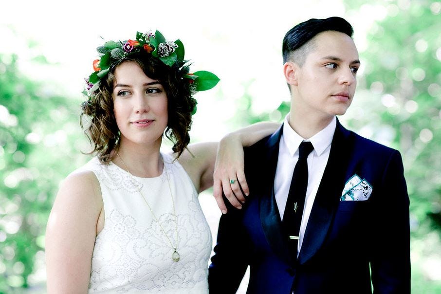 My wife, Lauren, and I were married on May 30, 2015, just a few short weeks before the Obergefell decision came down on June 26. In the months leading up to Our Special Day ™, many minute tasks were DIY’d by the two of us. Lauren — who also designed our invites, fashioned a flower crown out of bodega flowers, and rendered temporary tattoos as wedding favors (full disclosure: she’s an artist, and hey, we live in Brooklyn) — plunked down in a pair of boxer briefs to pen a short speech to be delivered after we cut the cake. The speech was intended to express our gratitude to our vendors, our families, and our friends, and to outwardly acknowledge our queerness, something that was inexorably important to the both of us when planning our wedding. She pointed her browser to SCOTUS’s website and cranked up her speakers to absorb the oral arguments presented to the court. This background music made its way into our speech (delivered almost exclusively by Lauren because I was too choked up to perform). I remember that moment, holding Lauren’s hand tightly, standing on a low stage and staring into the bright lights of this venue where Bill DeBlasio and countless other straight people had been joined in “holy matrimony,” thinking just how proud I was to be legally married (in New York state, anyway), but also very, very frightened about the imminent federal decision. But, also at that moment, I dared to hope. I dared to hope that my marriage would be validated in the open air, out of darkness and scrubbed of hundreds of years of systemic societal shame. I realized I didn’t want to feel brave anymore; I just wanted to feel normal and safe.