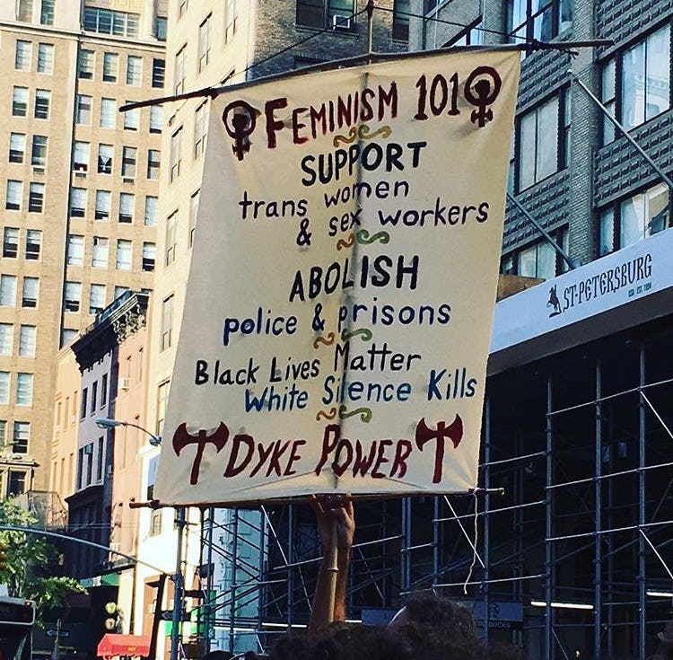 If there's anywhere you can learn about feminism, it's at a dyke march. One sign in particular perfectly summed up the brand of intersectional feminism that was being promoted and celebrated amongst the crowd. Young feminists take note!