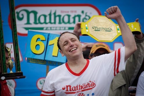 Chestnut is a longtime competitive eater who got his start 11 years ago in 2005. Then a college student, Chestnut consumed a whopping 6.3 pounds of asparagus in 11.5 minutes. From there, his zeal for the competition hasn't wavered. He currently holds several world records in different competitive eating events, packing away 32 pork roll sandwiches in 10 minutes last September in New Jersey, and 70 brats in 10 minutes at Cincinnati's Oktoberfest in 2013. One of his most recent (and most delicious sounding) world records was set on March 19, when he ate 14.5 pounds of boysenberry pie.