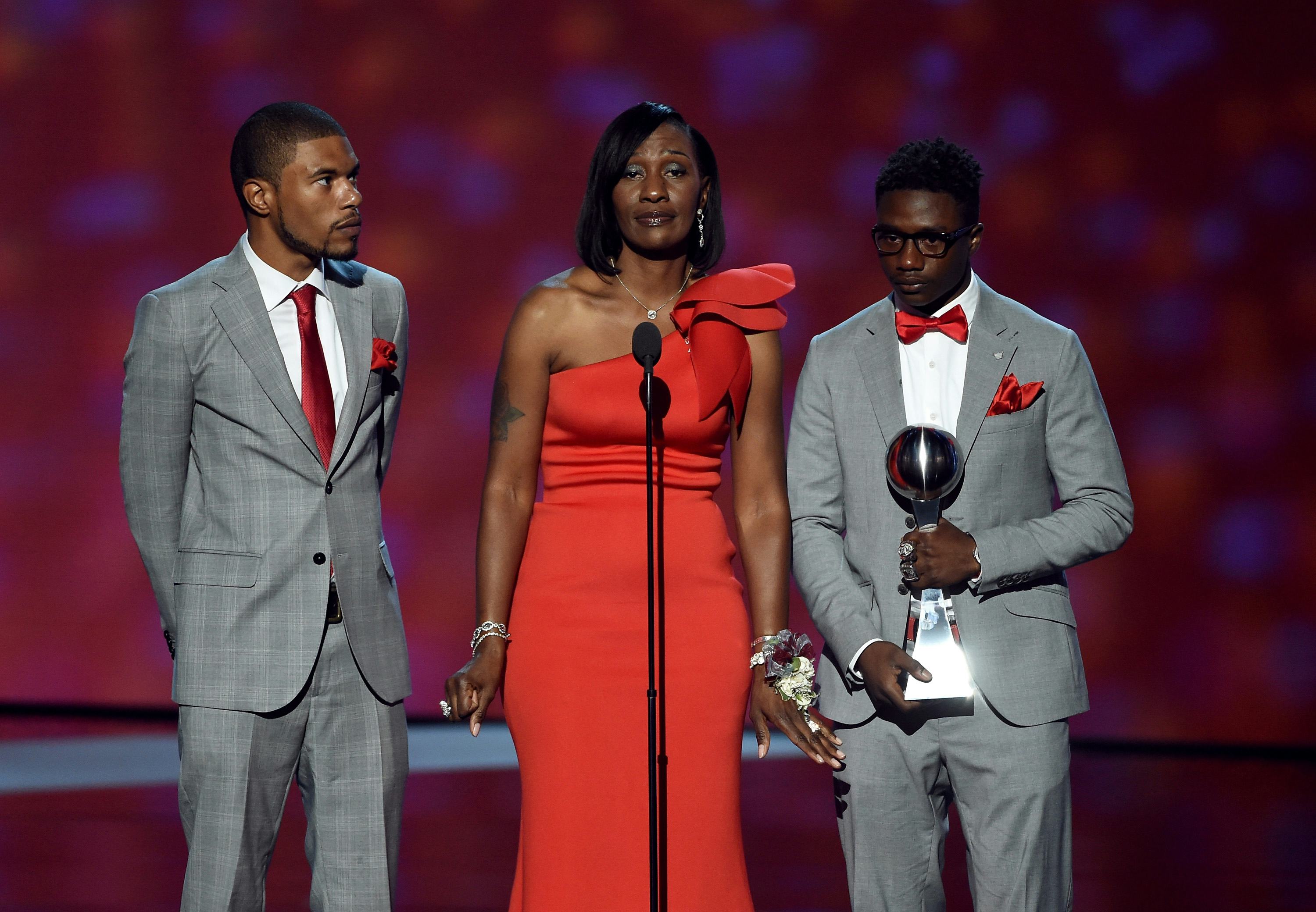 One of the most powerful moments of the ESPY Awards is the presentation of the Arthur Ashe Award for Courage. While last year's honoree Caitlyn Jenner was undoubtedly courageous in her own right, this year, the recipient of the ESPY Award was the late Zaevion Dobson, a 15-year-old high school football star who was shot and killed while trying to save his friends. Dobson was honored with the award in an incredibly moving video montage, a tribute to his life and act of heroism, followed by a rousing speech by his mother and two brothers to end gun violence.
