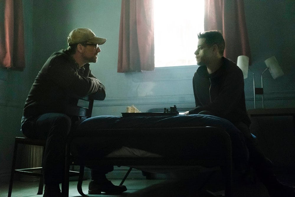 When the first season of USA's acclaimed drama Mr. Robot ended, the mind of our protagonist, Elliot Alderson, was in a fragile state. After learning that his chatty companion Mr. Robot was actually his dead father who only existed inside his head — and that his hacker cohort Darlene was actually his sister — Elliot's brain essentially shut down, blacking out for three days while he pulled off the Evil Corp hack. So how is he doing in Season 2? Not much better, I'm afraid; despite his best efforts to relcaim his sanity, Elliot and Mr. Robot are at war.