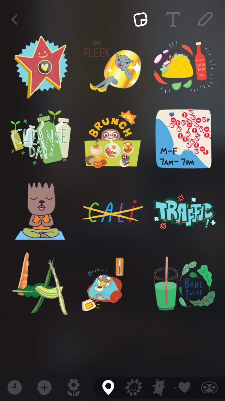When the app is open, you should click on the sticker icon in the top right corner of the screen. It will take you to the sticker menu. You'll see that the new feature was added at the bottom row. Start swiping right. That's where you will find the specific Geostickers in your area.