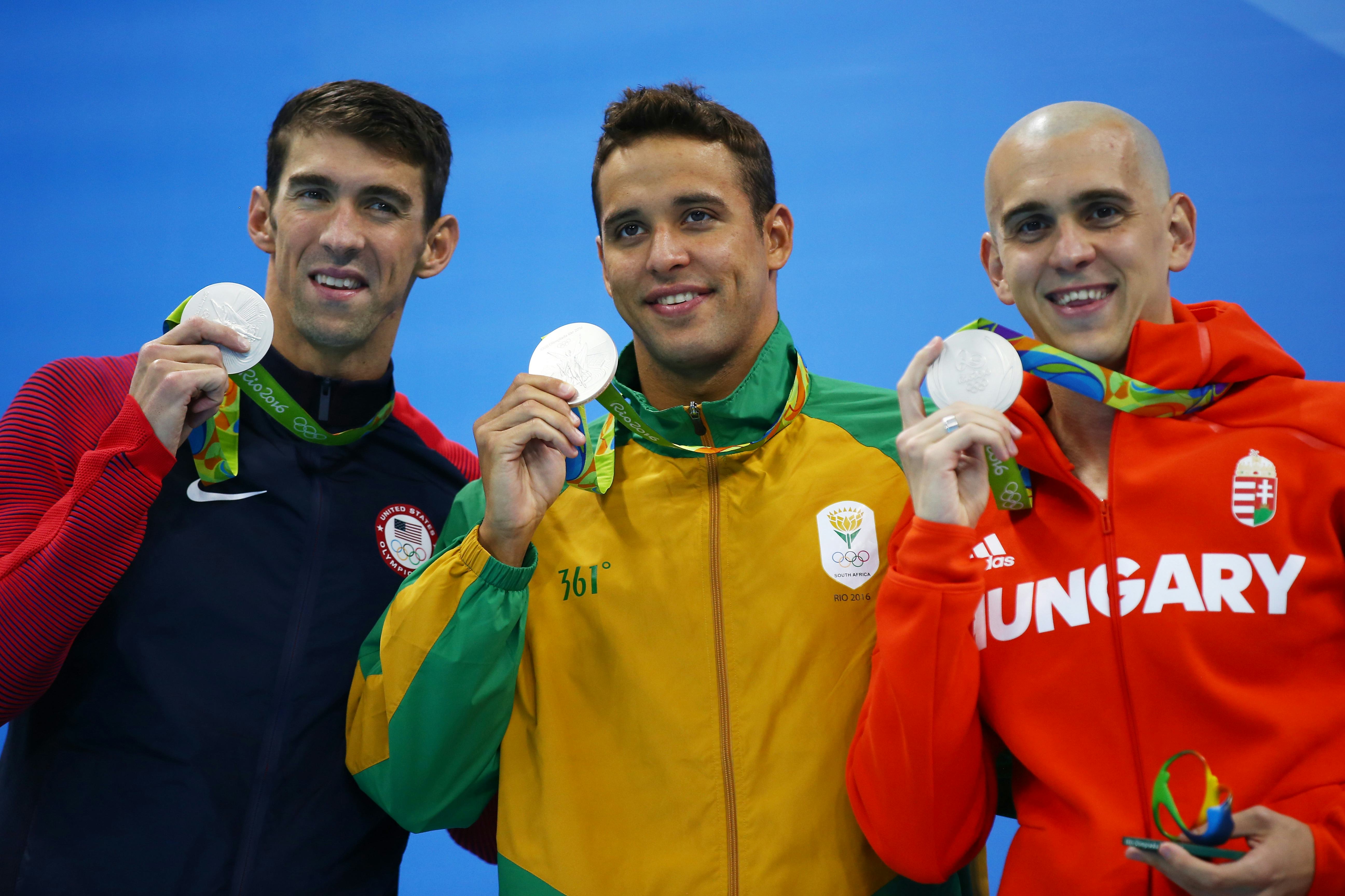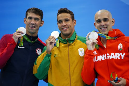 Just when you thought that multiple Olympic medal-winning swimmer Michael Phelps couldn't possibly have much ground left to break within the sport, he goes and manages to get himself involved in another great moment in sporting history. During Friday's 100-meter butterfly, Phelps finished in a three-way tie with Chad Le Clos of South Africa and Laszlo Cseh of Hungary — that's right, a three-way tie. As in, all three of them secured a silver medal, and they all stood on the podium together. It was a truly jaw-dropping moment that, honestly, I can barely get my head around. Like, has a three-way swimming tie ever happened before? And also, how can a three-way tie happen in swimming? I'm so bewildered by every aspect of this story right now.