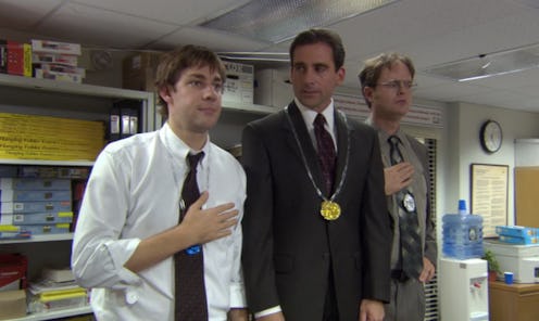 As all fans of The Office (especially the ones who have Netflix or beloved DVD collections) know, it's a show that you can watch over and over again and still laugh, or sometimes cry, as hard as you did the first time around. Not only are the jokes that killed on first watch still hilarious, but during repeat viewings you can notice more subtle moments that make the show more layered. But there is one strange instance even the most passionate fan may not have noticed. During an interview with Bustle while promoting The Hollars, which he stars in and directs, John Krasinski brings up a moment during the episode Office Olympics (Season 2, Episode 3) that still makes the cast laugh to this day — and that will make fans quickly go back for a closer look at the yogurt lid gold medals scene.