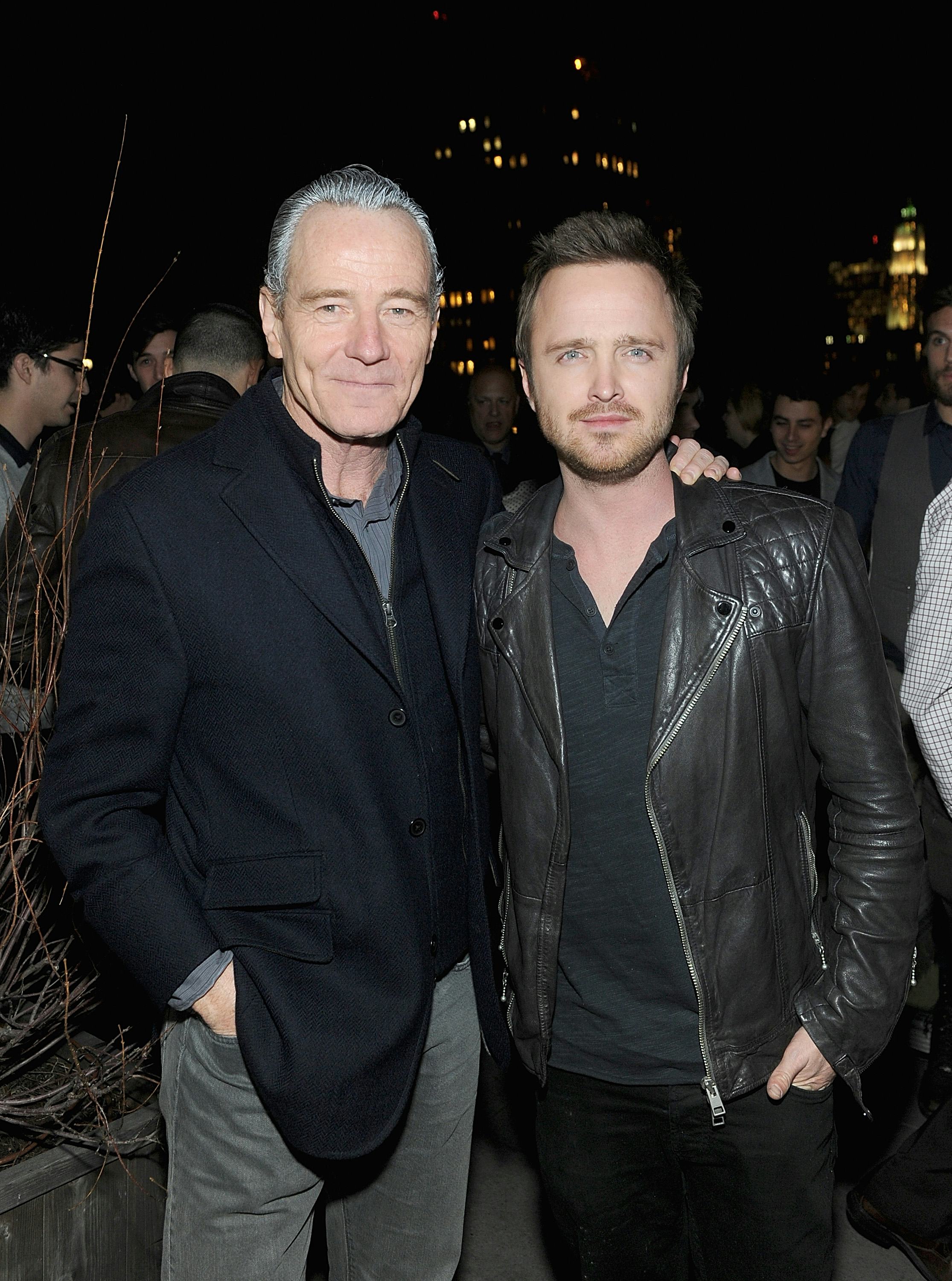 On Tuesday night, Cranston joined Paul at the New York premiere of the latter's latest movie, an action thriller featuring the former Bad star as a street-racer out to avenge the death of his friend. Cranston, who's currently starring as Lyndon B. Johnson in the Broadway production of All the Way, raced across town after the night's show to catch Paul at the premiere, his presidential hair-dye still intact. The former TV co-stars looked thrilled to be reunited, embracing each other's faces and doing silly poses for the cameras. In other words, it was a typical interaction between Cranston and Paul, whose off-screen bromance was one of the best things about Breaking Bad — and for a show that was nominated for forty-two Emmys during its five-season run, that's saying a lot.