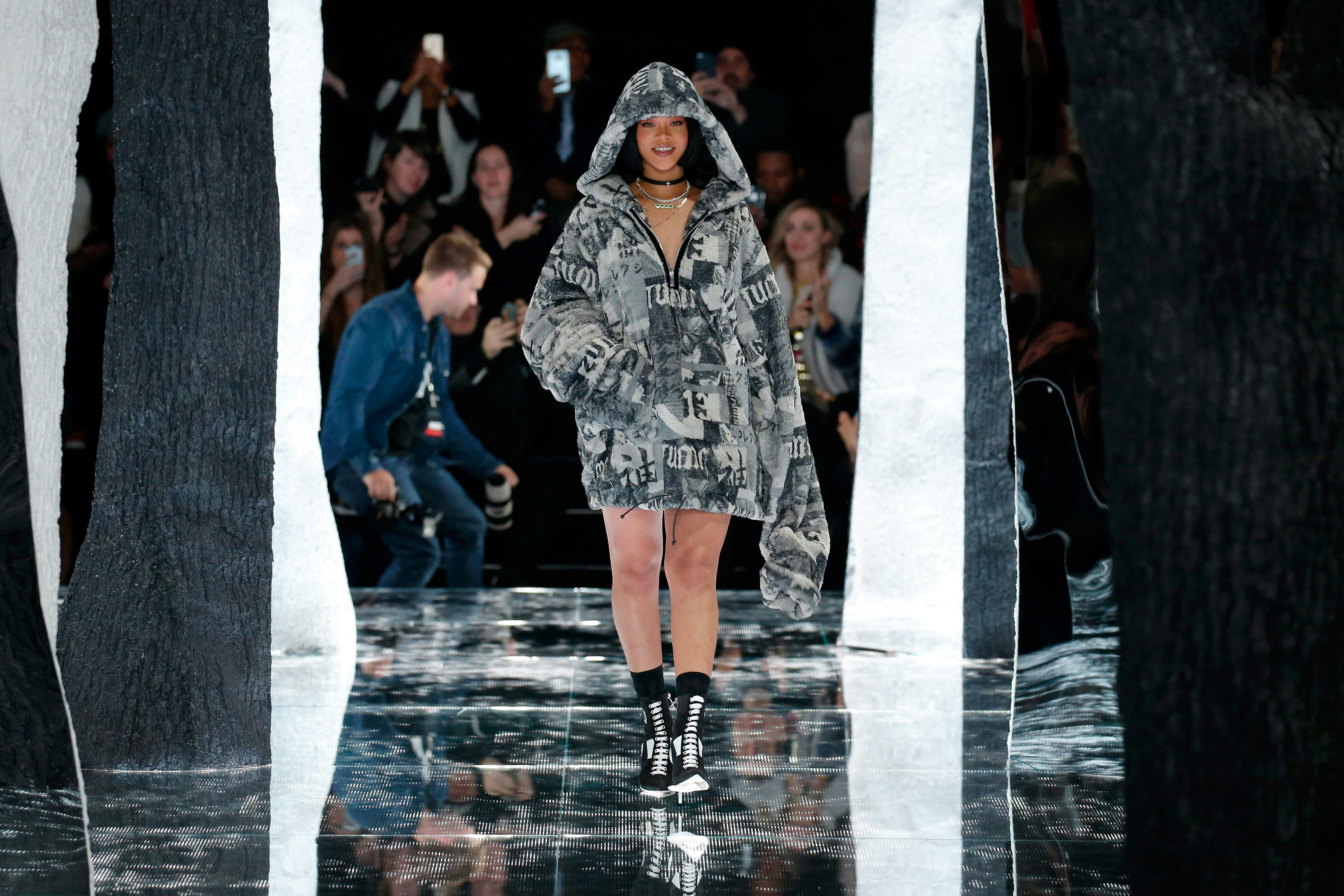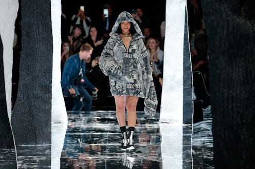 If I saw Rihanna walking up the catwalk in this ensemble, I'd be clapping and taking thousands of pictures myself. Though not overtly camouflage, this oversized hooded coat Rihanna designed herself in collaboration with Puma included patchworks of the pattern collaged together with other motifs. Slay!