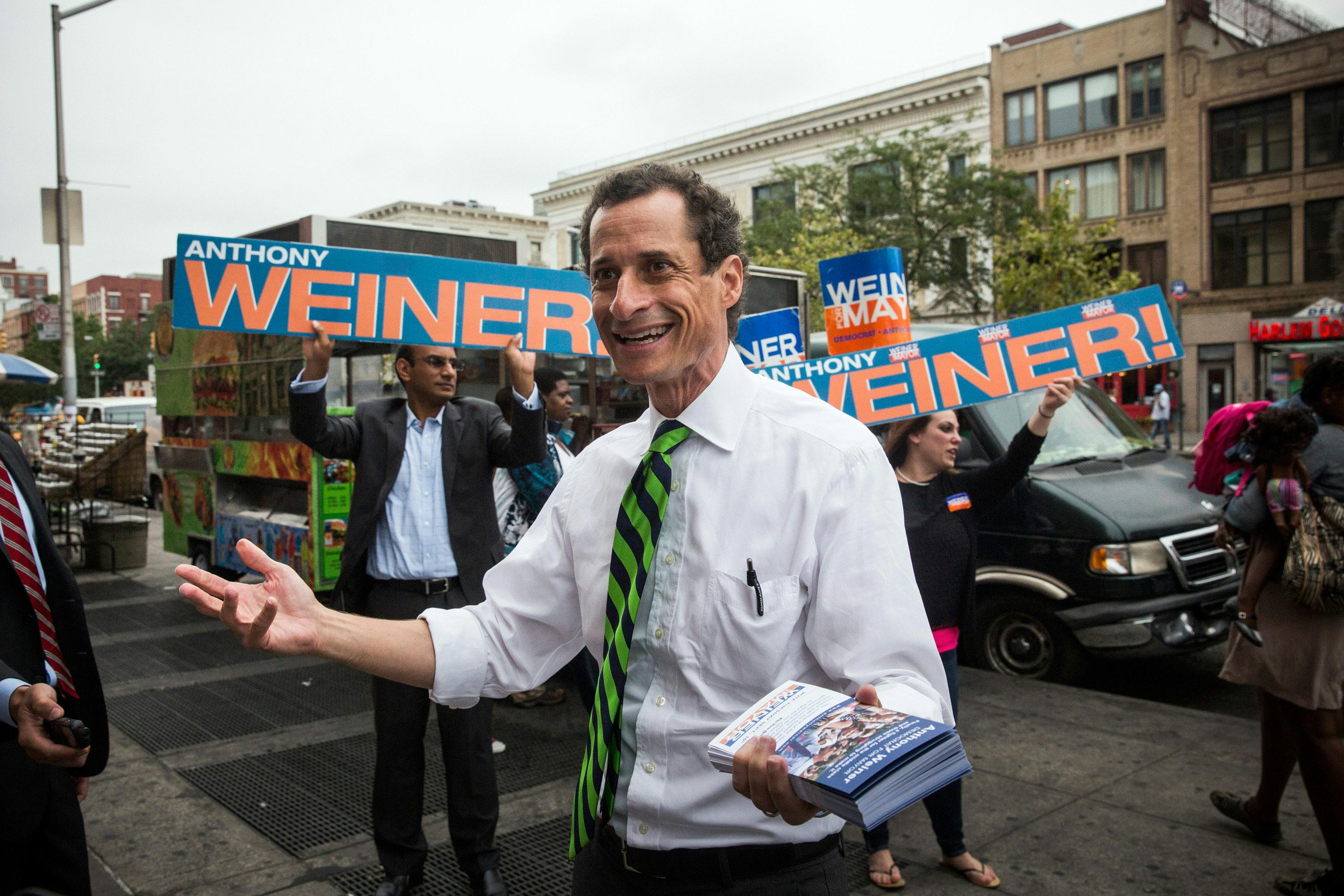 Colbert starts the segment by describing Weiner's new scandal to his audience. As originally reported by The New York Post, leaked screenshots allegedly showed an explicit conversation between Weiner and an unidentified woman. This resulted in Weiner's wife, top Hillary Clinton aide Huma Abedin, announcing their separation just hours later. Colbert described the situation a little more succinctly: He said that there were new reports of "sext messages from the disgraced former congressman turned disgraced former mayoral candidate." (Weiner had previously been involved in sexting scandals in 2011 and 2013, according to CNN, over which he resigned from Congress and later lost a bid for New York City mayor, respectively).