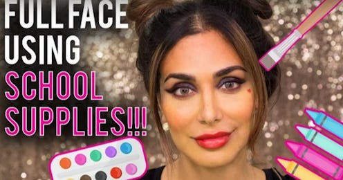 When it came to back-to school-supplies, chances were you weren't excited to break out the colored pencils and markers in order to use them as makeup bag substitutes. But beauty vlogger Huda Kattan's new makeup tutorial does just that — she creates a full face of makeup with school supplies. While that might sound like it could make for some pretty Kindergarten-level like results, the outcome is surprisingly amazing.