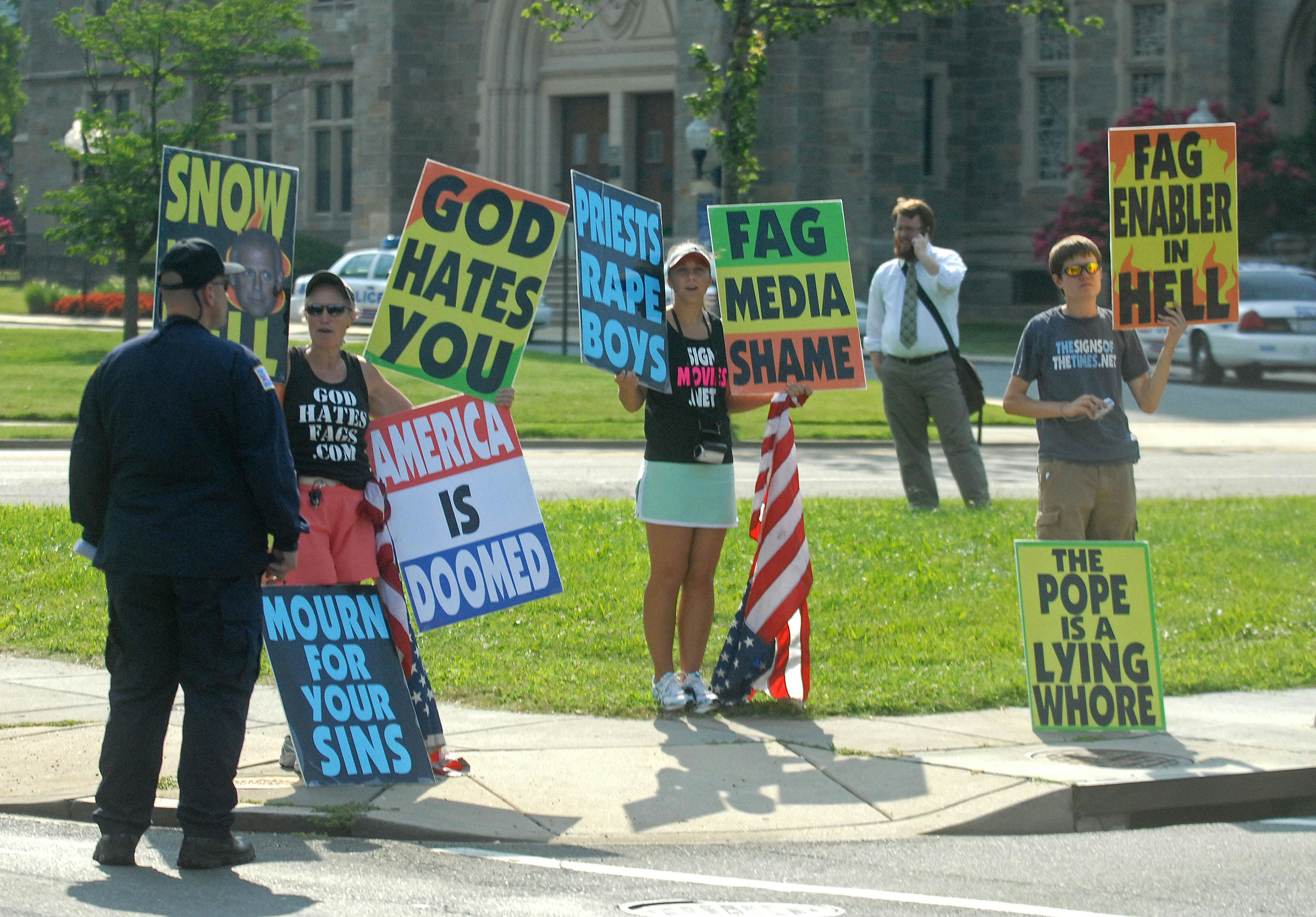 Phelps founded the Westboro Baptist Church in 1955. It has around 40 members, most of whom are part of the Phelps family, but has consistently attracted national attention both for its outspoken anti-Americanism and a virulent brand of homophobia that makes Vladimir Putin look like Harvey Milk. Classified as a hate group by the Southern Poverty Law Center, WBC’s highlights include screaming “God Hates Fags” at military funerals, thanking God for the Boston Marathon Bombings and, perhaps most disturbingly, indoctrinating its child members with the church’s ideology.