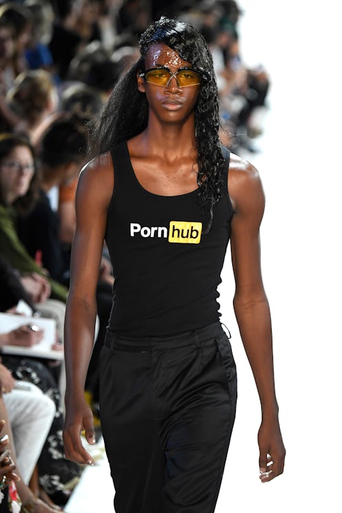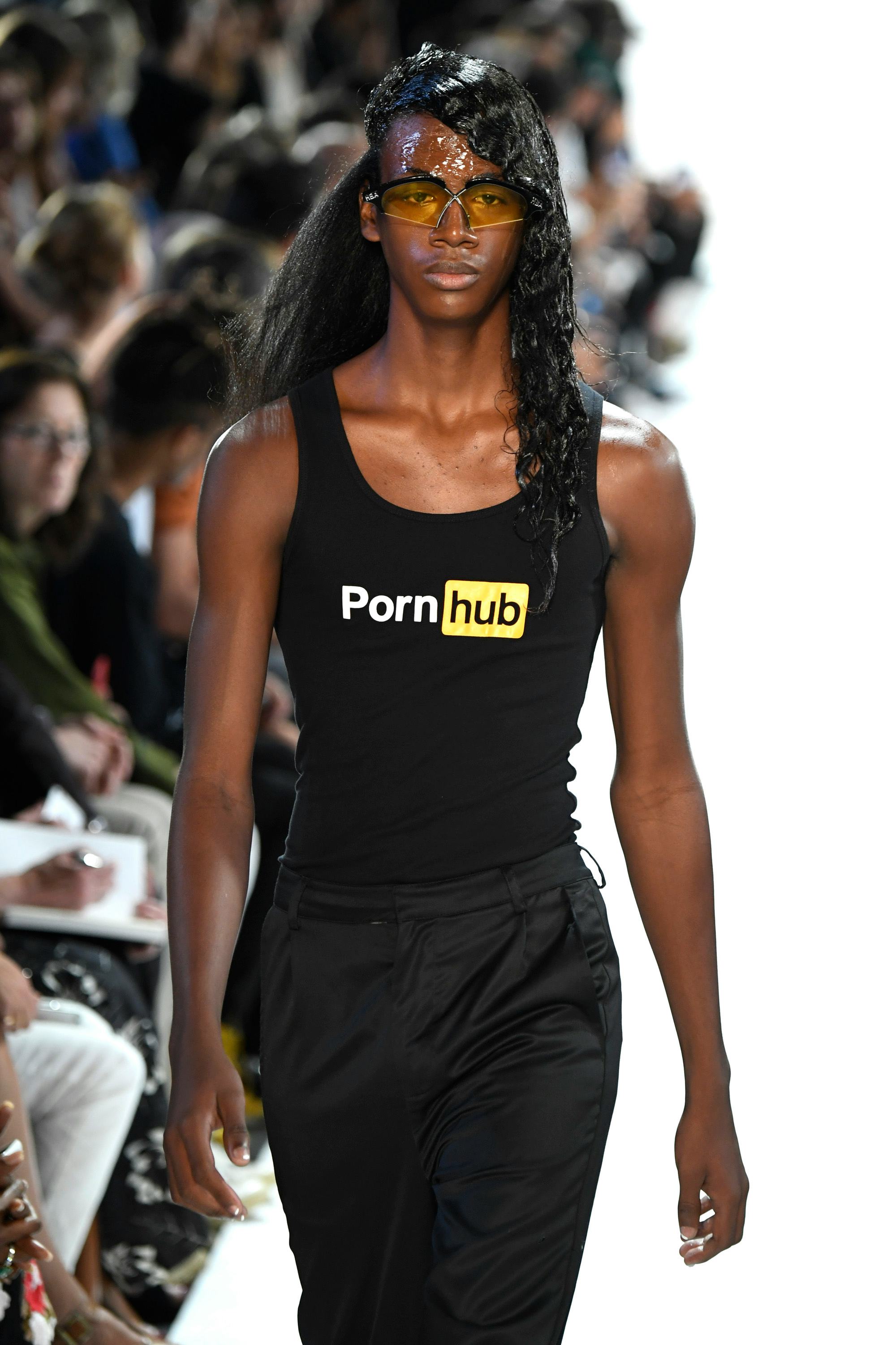 At the HBA show on Sunday morning, models walked down the runway literally covered in lube. Their hair, faces, and nails were completely slicked in clear gel that looked like they had just stepped off of a porn shoot. The show also happened to be sponsored by PornHub, which made the whole thing very, shall we say, NSFW.