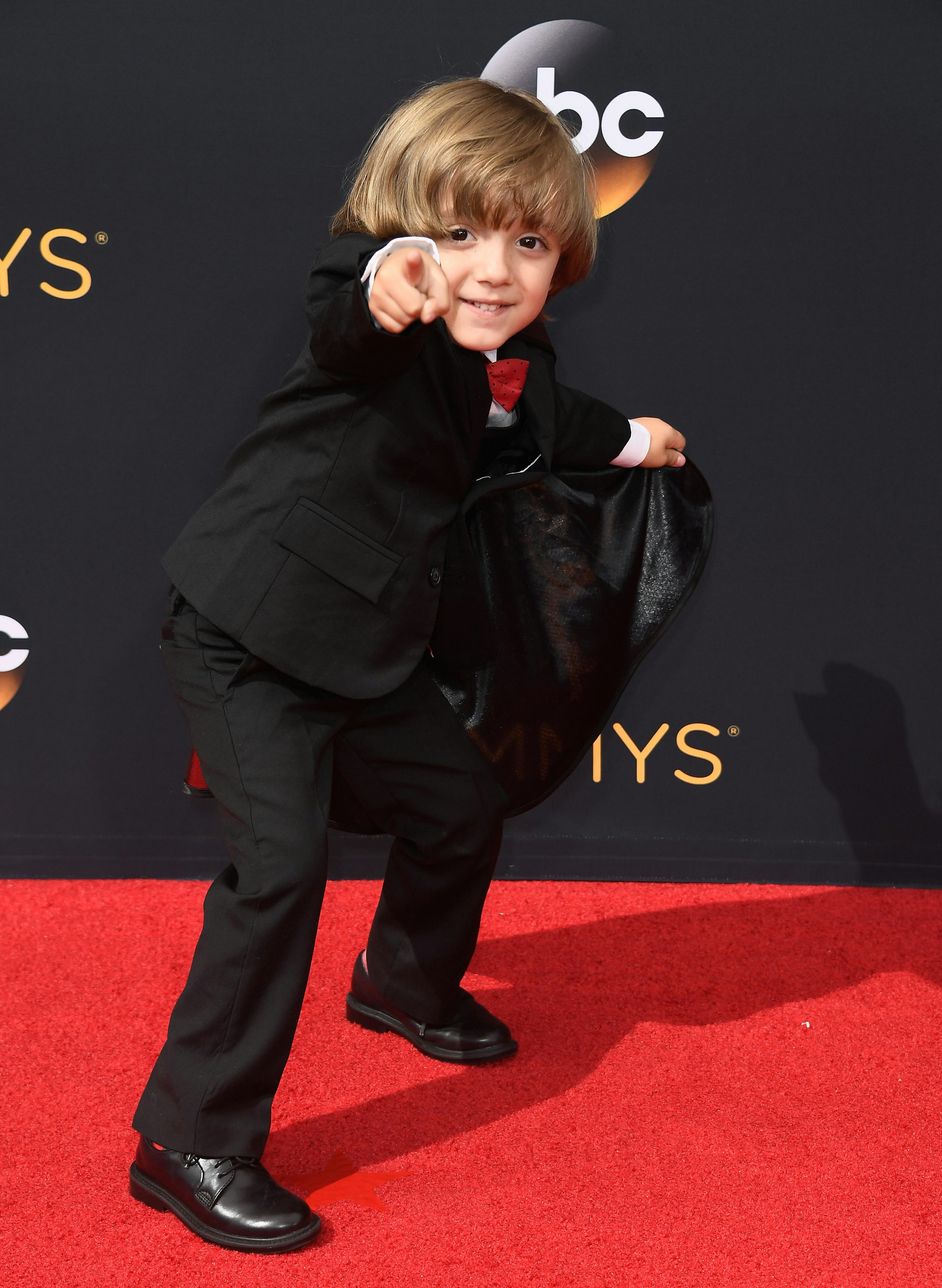 Yeah, yeah, yeah — there are plenty of gorgeous, sparkly dresses on the Emmys red carpet tonight, but the show has officially already been stolen by a star who didn't even have to bother with high heels. You may be wondering: Who is that adorable little boy owning the Emmys red carpet in a tuxedo, red bow tie, and full cape?!