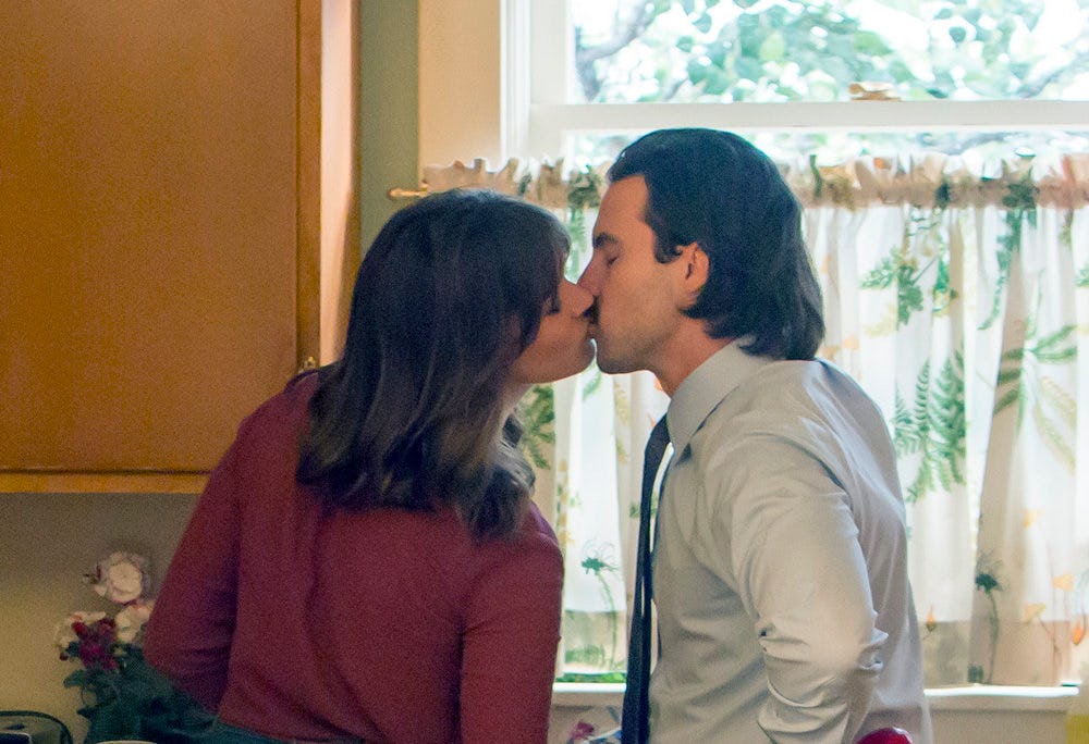 Basically, the whole reason I started watching This Is Us was so that I could see Jamie Sullivan and Jess Mariano as a beautiful couple raising babies together, but boy is this show way more complicated than that. Don’t worry though — it's complicated in all of the best ways. In the second episode of the series, which aired on Sept. 27, Rebecca (Mandy Moore) and Jack (Milo Ventimiglia) are married with three kids in the late 1980s, but in the present day, those kids (Randall, Kate, and Kevin) talk about the fact that their father has passed away. Then, at the end of the episode, it’s revealed that Rebecca has married Miguel, Jack’s old best friend, which raises so many questions. How did Jack die on This Is Us ? When did Rebecca get remarried? How did she end up falling for Miguel?