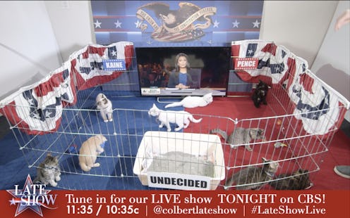 The vice presidential debate on Tuesday involved markedly more substantive issues than the first presidential debate. There was no lack of tension between Mike Pence and Tim Kaine, but it was much less dramatic than the 90 minute-long exchange between Hillary Clinton and Donald Trump the week before. While focus groups have abounded in the wake of the VP debate, there will surely be discussions about their conclusions. One particular demographic stood out — though it may not be remembered as the most consequential of focus groups, The Late Show with Stephen Colbert 's all-kitten focus group was definitely the fluffiest of all.