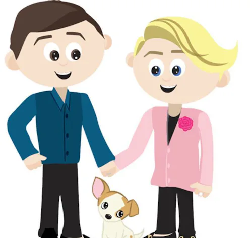 The first emoji is Blandino, his husband Jeremy Johnson, and their crazy cute dog Clover. It's an adorably animated family portrait. Of course Blandino's blonde locks are fab and he is rocking a powder pink blazer, which is the signature Too Faced packaging hue.