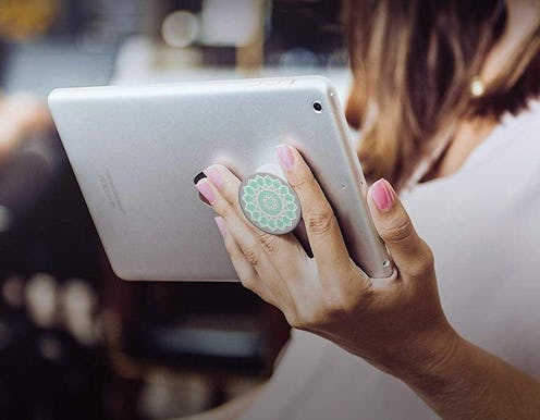 The PopSocket is a little expanding handle that sticks to the back of your phone and can be used to tilt, grip, or prop while taking pictures, watching movies, or texting. When it’s not in use, it folds right back in. This one has a pretty peace mandala print.
