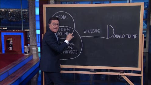 On the Oct. 17 episode of The Late Show with Stephen Colbert, the host tried getting to the root of Donald Trump's conspiracy theories about what will keep him from winning the presidency on Election Day. From sex scandals to negative media coverage to the Clinton Machine, it's like there's no end to the list of things supposedly trying to take down the Republican nominee. Every week, the man finds himself in a new political tornado, each one triggering a dip in his poll numbers, necessitating apology statements from himself and his family, prompting tougher questions at debates and interviews, and, best of all, padding Saturday Night Live’s ideas for ways to mock him.