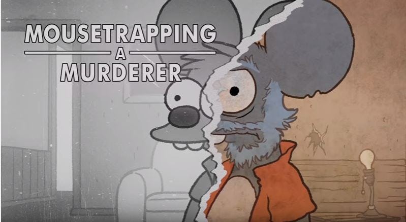 In a parodied show called Mousetrapping A Murderer, viewers are treated to the now-familiar music and sepia-toned opening montage reminiscent of Making a Murderer. But this time, photos of Itchy, the murderous mouse of the duo, is pictured as a youngster with his family. A court document titled "People v. Itchy" appears on screen, along with Itchy putting up his right hand in a solemn swear to tell the truth. The scene immediately changes to that of a farmers market, where Scratchy comes up to a butcher's stand, staffed by Itchy, and asks for a slice. Blood spatters ensue as Itchy cuts Scratchy up into a bunch of pieces, and back on their couch, Bart and Lisa Simpson laugh uproariously at the graphic violence on their screen. As you'd expect the show's spoof is pretty creepy.