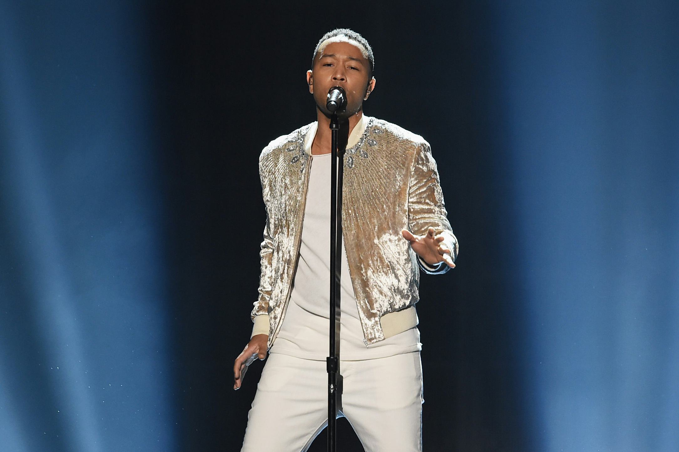 There are so many Teigen x Legend fashion topics to discuss this evening! Chrissy Teigen's 2016 AMAs dress boasted the highest slit, like, ever. It pretty much stole the entire show. But it wasn't the only thing people were talking about in regards to the fashion choices of the model and her husband, singer John Legend. Actually, John Legend's 2016 AMAs performance outfit was a big hit on Twitter in that it generated a lot of chatter and discussion. Legend wore a velvet and bejeweled bomber jacket while performing his latest single "Love Me Now." It was busy and had a lot going on and that is likely why it generated such intense and immediate reactions.