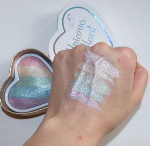 The illuminator looks like something straight out of our second grade daydreams. Coming in a heart-shaped white box, the nine dollar product is "a glimmering, pastel illuminator featuring stripes of lavender, crystal blue, mint, canary yellow, and baby pink pigment," Popsugar reported. The case has "Unicorn Hearts" written across it in a colorful foil worked into cursive, and a dancing unicorn decorating it in the corner. The words "a rainbow highlighter made by real unicorns" is written right under it, increasing its fancy by a factor of 10.