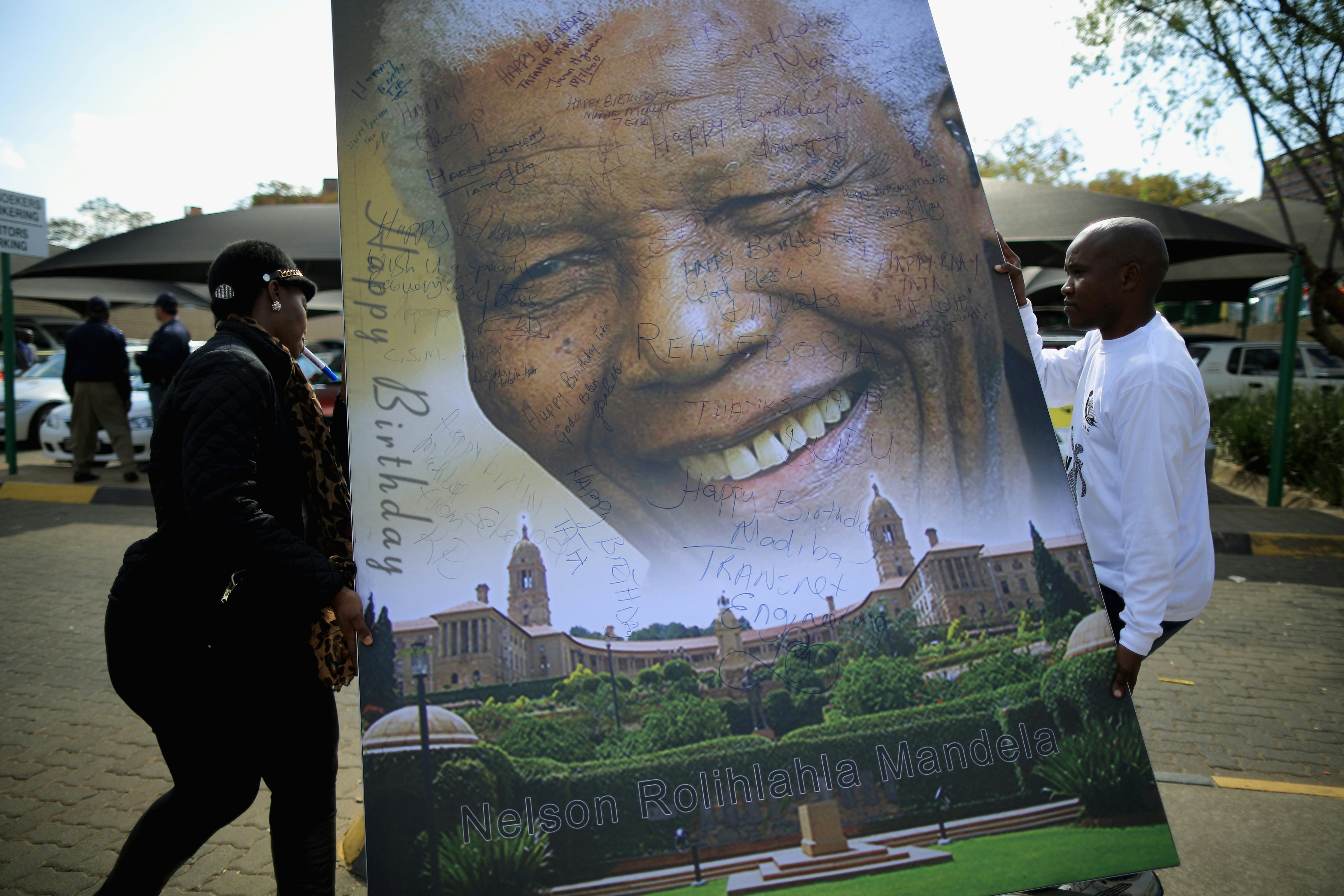 "I visited him today," current South African president Jacob Zuma told press. "I was able to say 'happy birthday,' and he was able to smile." Daughter Zindzi added that her father was making "remarkable progress," and that she couldn't wait to have him home.