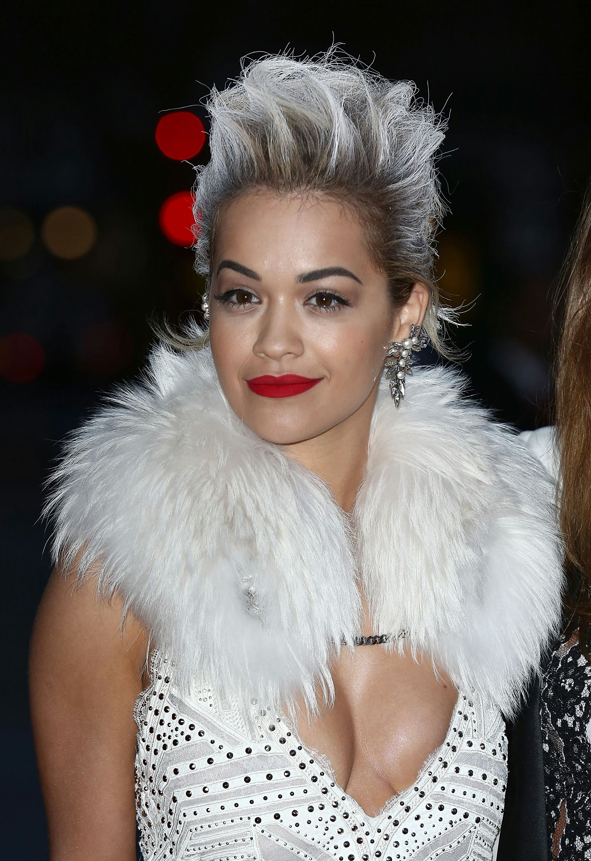 Ora, for one, has never been the kind of star to back down from daring outfits, and she didn’t make an exception at the Italian fashion exhibition. Donning an all-white Roberto Cavalli look straight from the Fall 2014 runway, the British singer dazzled in a low-cut, leather, fringe-hem dress complete with all-over stud detailing and a fierce fur collar. Topping off the look with a white-tipped, swept-back ‘do; white, strappy sandals; a simple white shoulder bag; and her signature bold red lip, Ora was the walking, talking picture of Italian fashion.